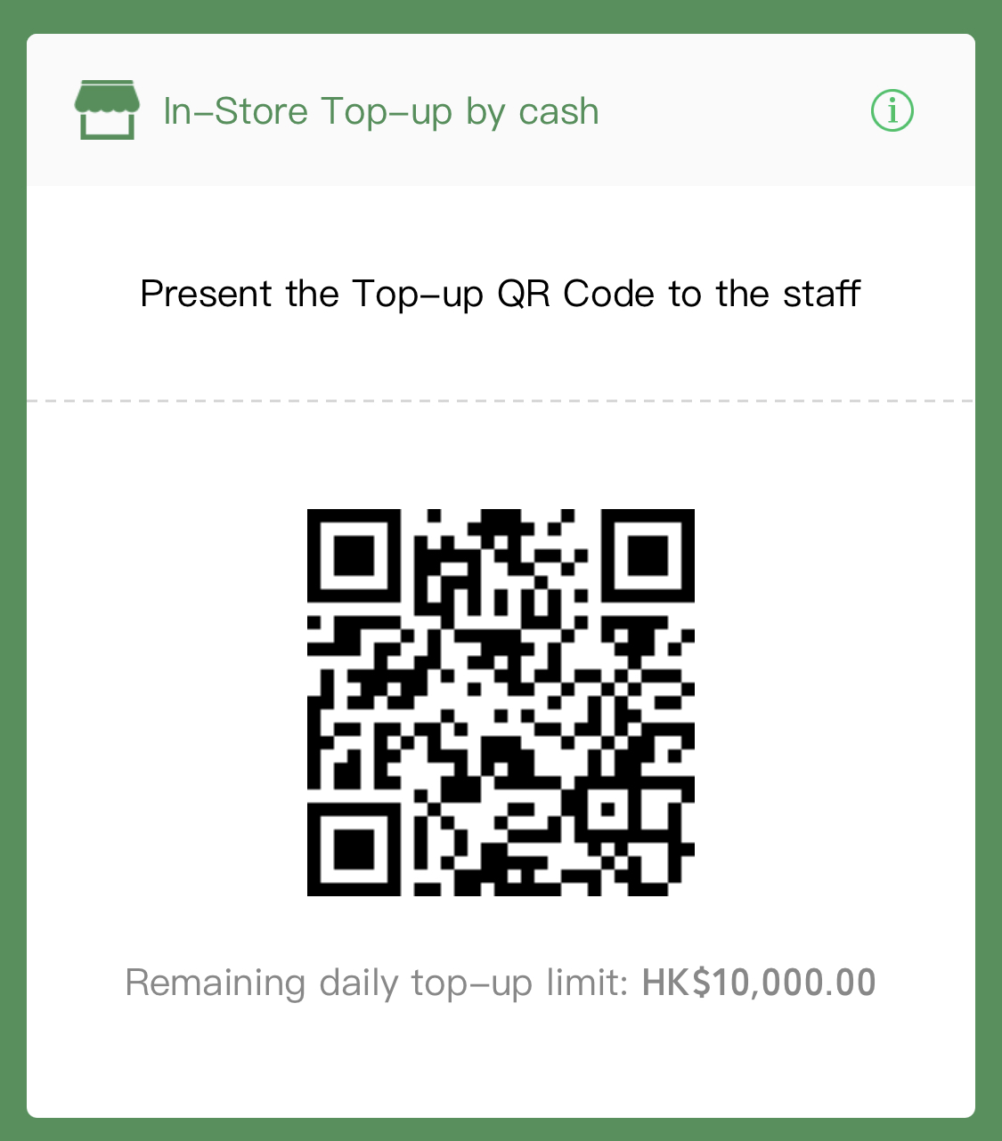 出示QR code比職員做WeChat pay充值,金額為訂單總金額。